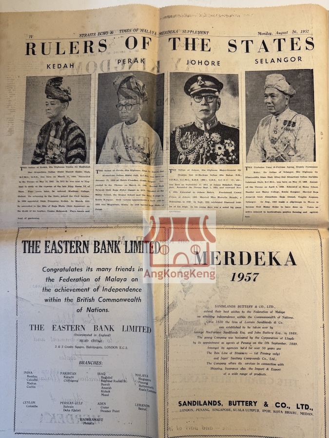 1957年独立日特刊 Straits Echo & Times of Malaya Merdeka Supplement 1957 旧报纸档案 Next Article 新加坡华人庆新年 Singapore Chinese Celebrate New Year-The Straits Times 1939Feb21 请评级 投票1 投票2 投票3 投票4 投票5 1957年独立日特刊 Monday, August 26, 1957 Straits Echo & Times of Malaya Merdeka Supplement 此乃我们收藏的旧报纸,只拍几页供参考!!! Next Article 新加坡华人庆新年 Singapore Chinese Celebrate New Year-The Straits Times 1939Feb21